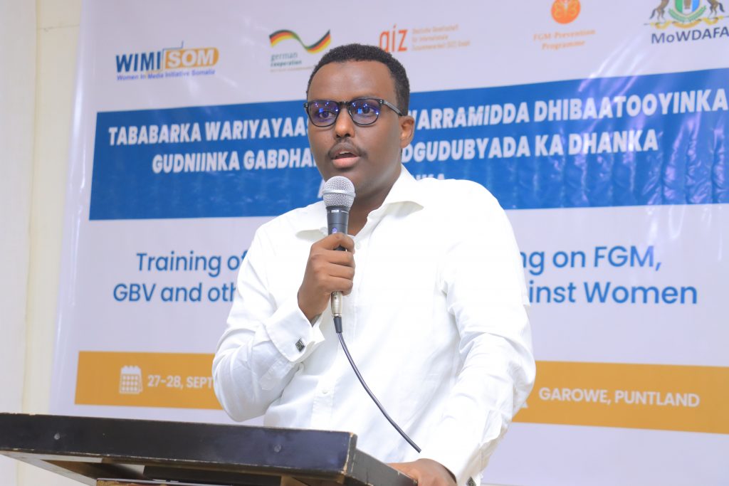 The workshop, which brought together 20 journalists from across Puntland, aimed to enhance participants’ understanding of FGM and GBV, while equipping them with the skills to produce ethical and impactful stories on these sensitive issues. The sessions covered safeguarding survivors’ information, adhering to professional reporting standards, and effectively utilizing awareness messages developed by the Ministry of Women Development and Family Affairs.